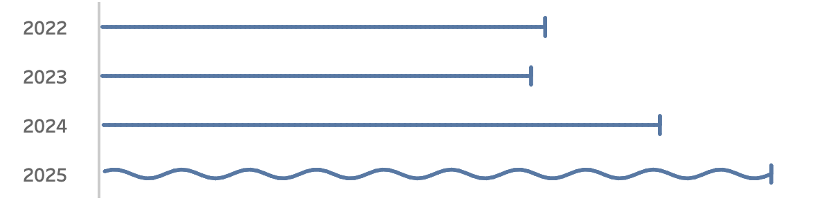 Recently I ran into a small but surprisingly tricky problem: how do you visualize something that’s in progress? A standard bar chart works usually perfectly for completed values, but what about the final bar isn’t finished yet because e.g. the year isn’t finished yet, Fading it out, changing the shape or adding a label like…